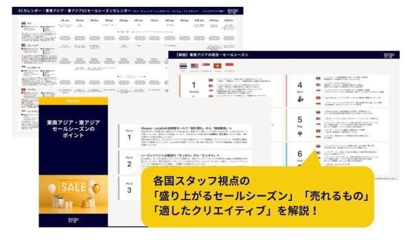 宗教や現地の習慣に根ざす行事から、Shopee・Lazadaなどの大手ECプラットフォームが頻繁に実施するセールまで、東南アジア・東アジア各国の商戦期や売れる商品の傾向を、最新のトレンドも交えて解説。
